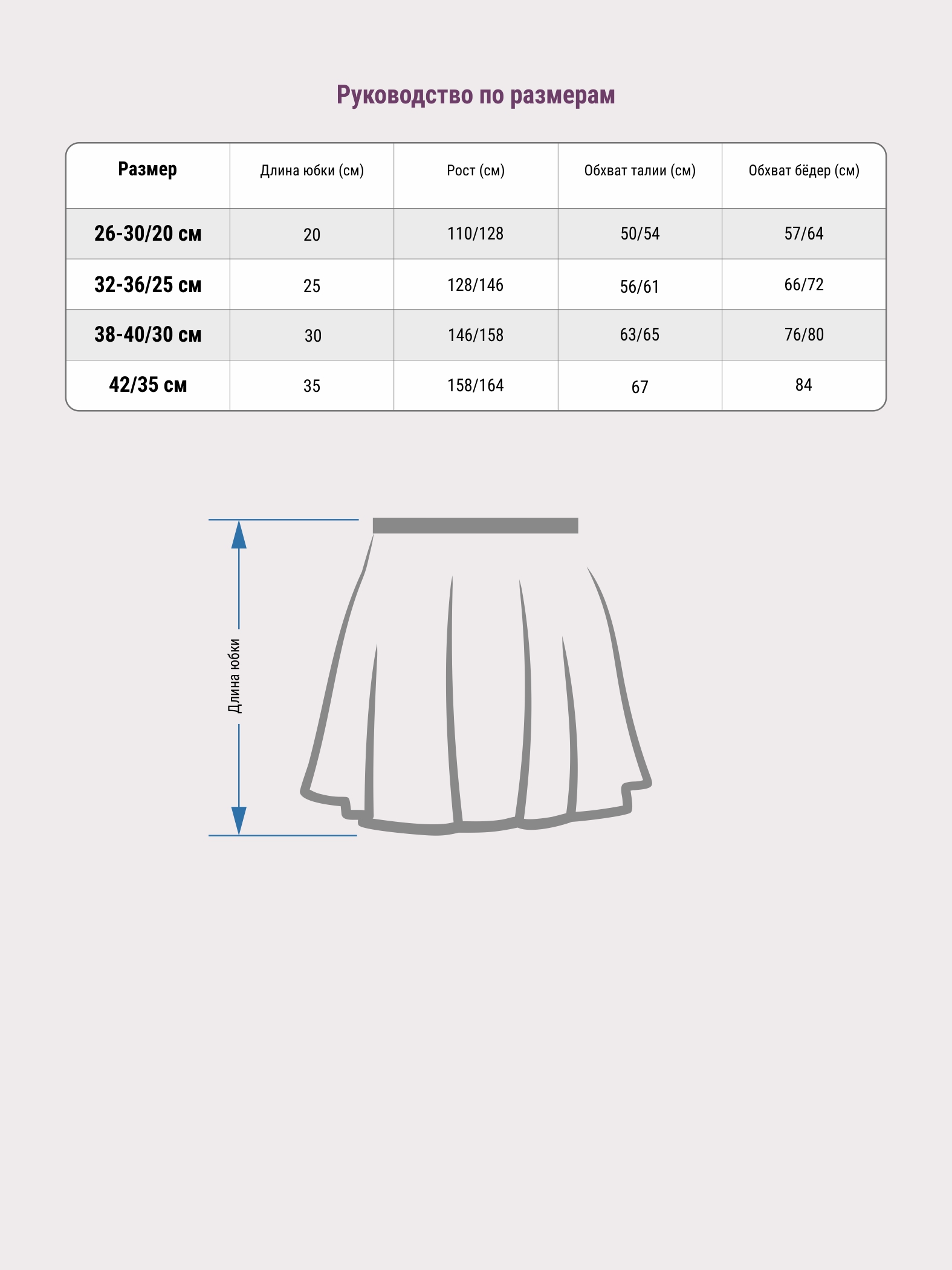 | Размер | Длина юбки (см) | Рост (см) | Обхват талии (см) | Обхват бёдер (см) |